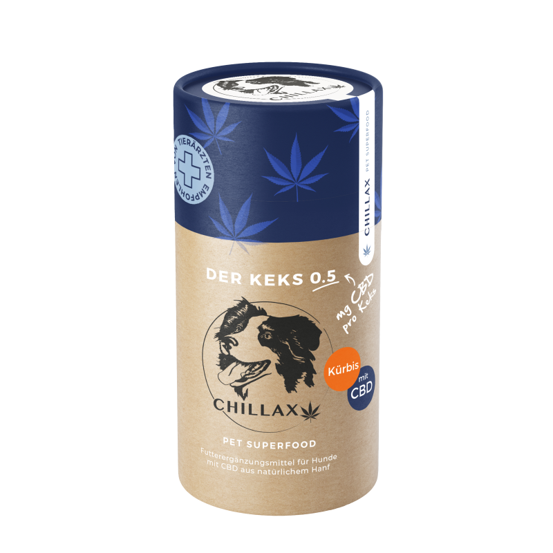 Ein langes, entspanntes und gesundes Hundeleben dank den Kürbis-Huhn-Keksen mit CBD von Chillax. Die Kekse fördern die Entspannung, die Mobilität und das Wohlbefinden.